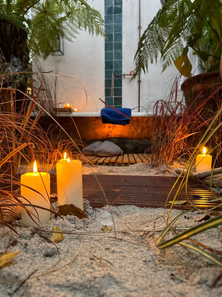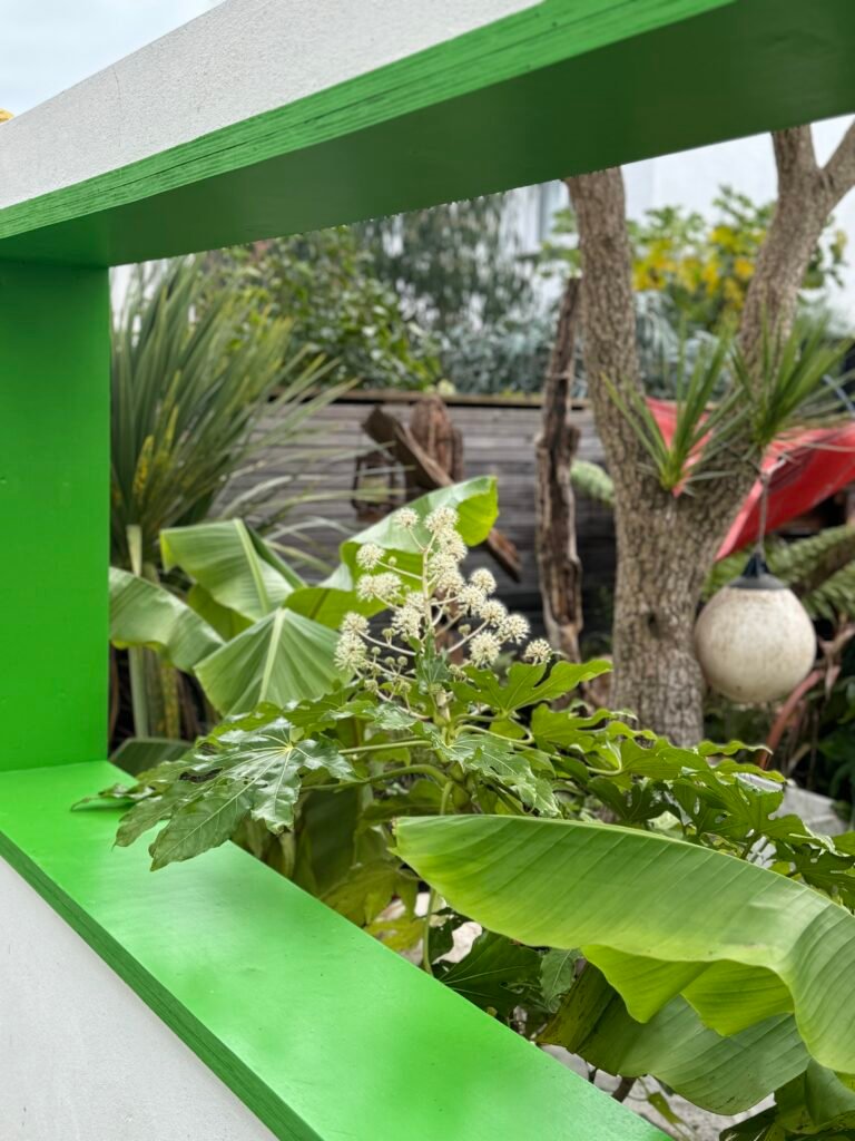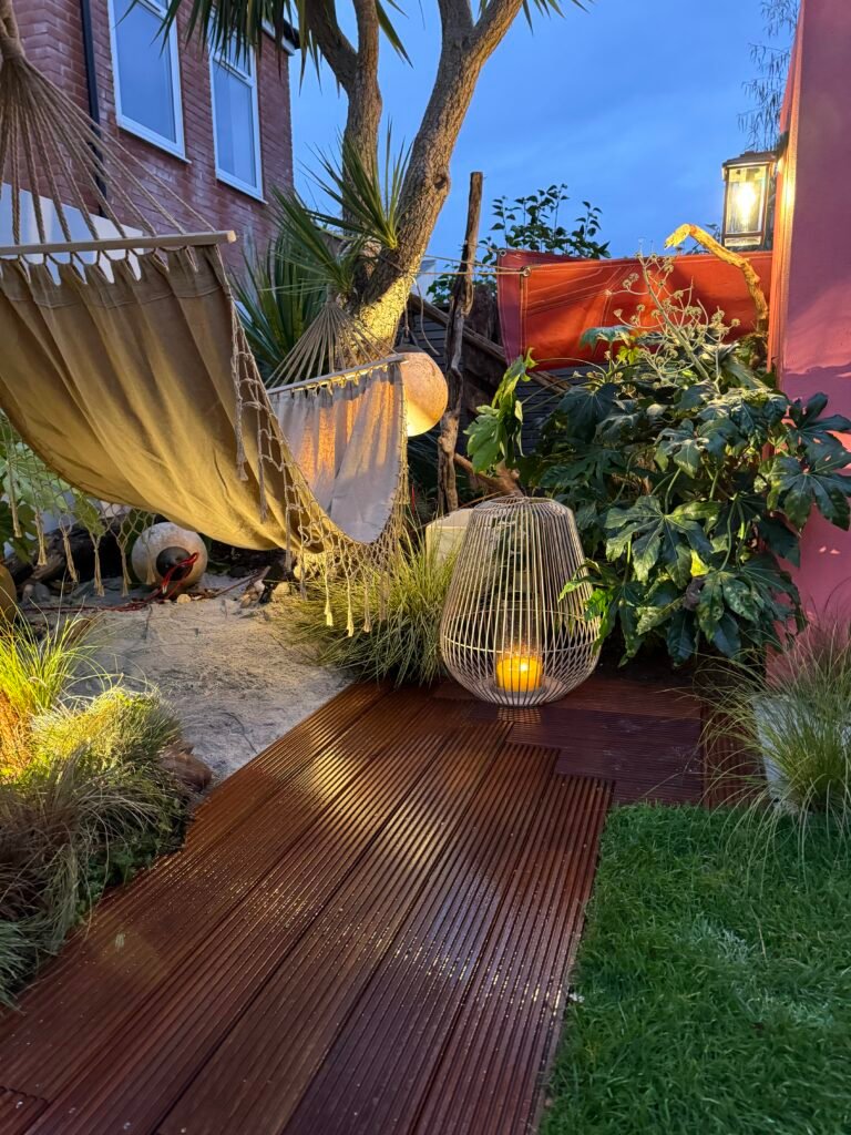 The 80m² garden was transformed through bold use of architectural height, sculptural walls and mature tree ferns to create distinct zones and a strong sense of enclosure. Inspired by Moroccan courtyard gardens, the space now includes an outdoor kitchen, shower and roll-top bath, alongside hardwood decking and layered, textural planting.