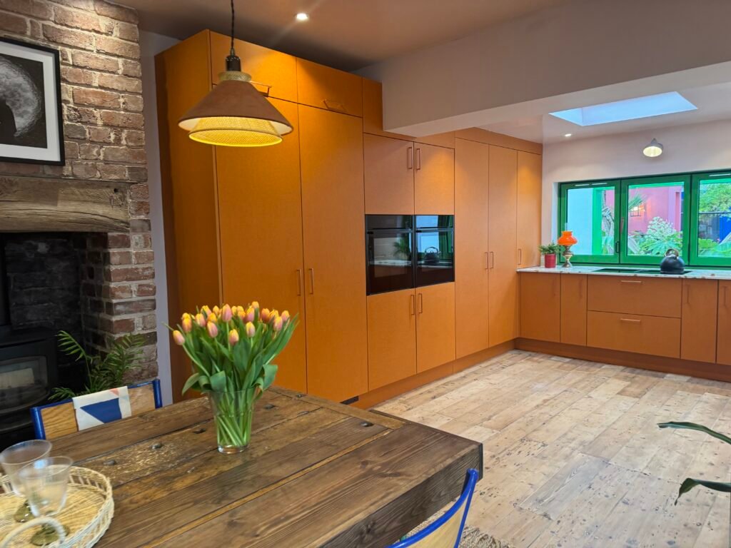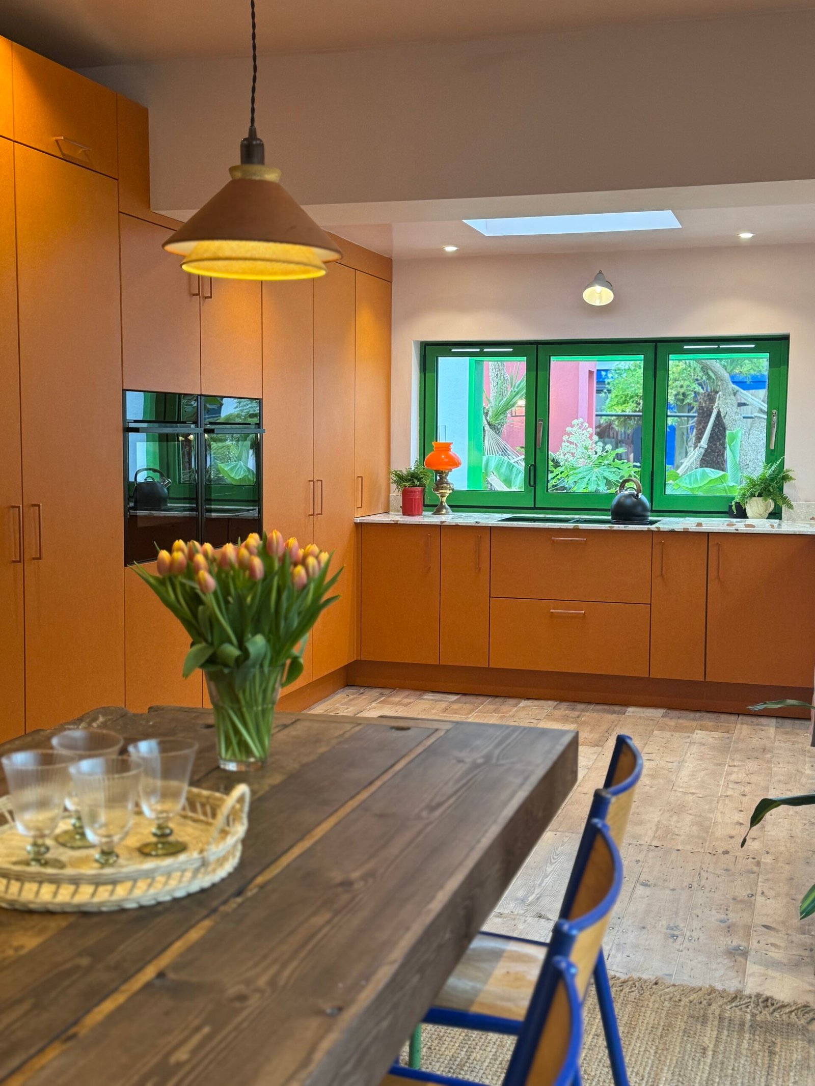 The kitchen was previously closed off from the garden. We introduced a bespoke garden window and bifolding system to visually and physically connect the two spaces. A fully custom MDF kitchen with terrazzo worktops, bold block colour cabinetry and full Building Control sign-off completes the renovation, blending rustic warmth with contemporary design.